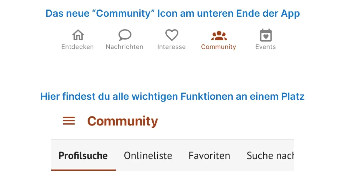Für alle, die unsere App und die WebApp nutzen, haben wir vor Kurzem eine kleine, aber – wie wir finden – sehr feine Änderung vorgenommen, damit die Partnersuche bei uns noch einfacher wird: Wir haben die Profilsuche, die Onlineliste, eure gespeicherten Favoriten und die Suche nach Namen unter dem Punkt „Community“ in der unteren Navigation zusammengefasst.