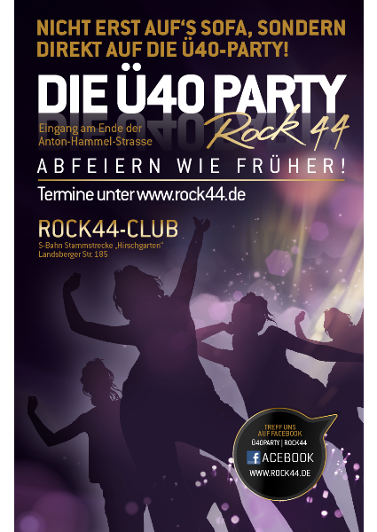 Am Samstag, 8. September findet die 3-jährige Geburtstagsparty der Ü40 Party|rock44 statt. Diese Partyreihe hat als Münchner Singles Party angefangen und ist inzwischen in München als Ü40 Party etabliert. Wie bei der ersten Müsiparty legen die DJs Sephra und No_quer auf. Die Ü40 Party freut sich über viele Münchner Singles Stammgäste, die sich in der „Müsiecke“ im hinteren Bereich der rechten Bar treffen. Weitere Infos unter http://www.rock44.de Die Party findet im Club Rock44 auf dem Geländer der Nachtgalerie, Landsberger Str. 185 statt, mit Rockmusik, 80er Party oder Musik querbeet durch die Jahrzehnte bis heute.